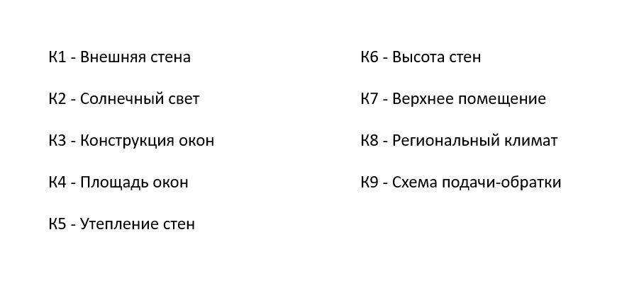 K1 – внешняя стена. Большее количество этих стен навлекает большую теплопотерю. Если она одна, то K1 составит 1,0. Две – 1,2. Три – 1,3. Четыре – 1,4.