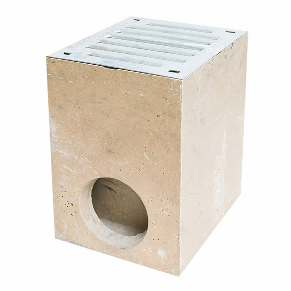 Самодельный дождеприемник из полимербетона отличатся высокой прочностью. При этом весит меньше, чем его бетонный аналог. Выпускается в виде цилиндра или куба.