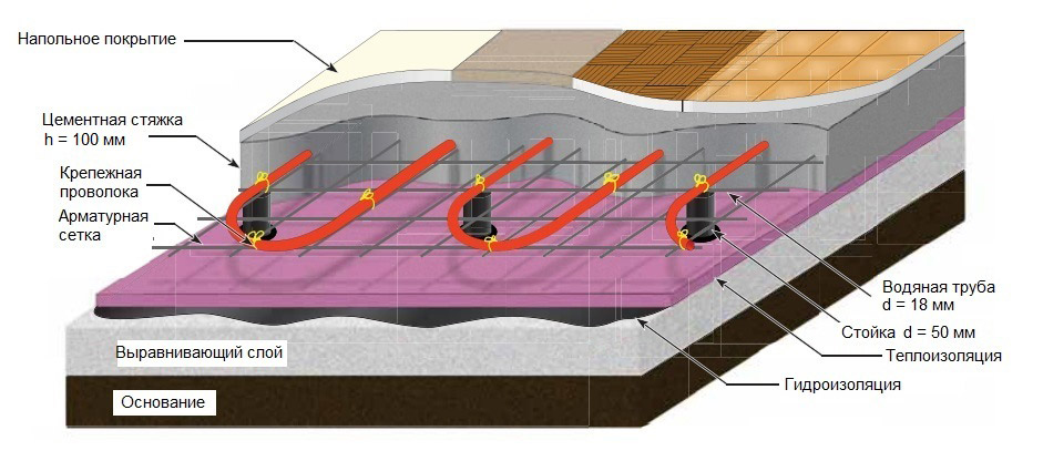 На черновой пол укладывается слой гидроизоляции, утепление и армирующая сетка. Трубопровод закрепляется сообразно выбранной схеме, после чего конструкция заливается бетонной смесью. Поскольку пол заливается уже после укладки труб, необходимость в трудоемком штробировании отпадает.