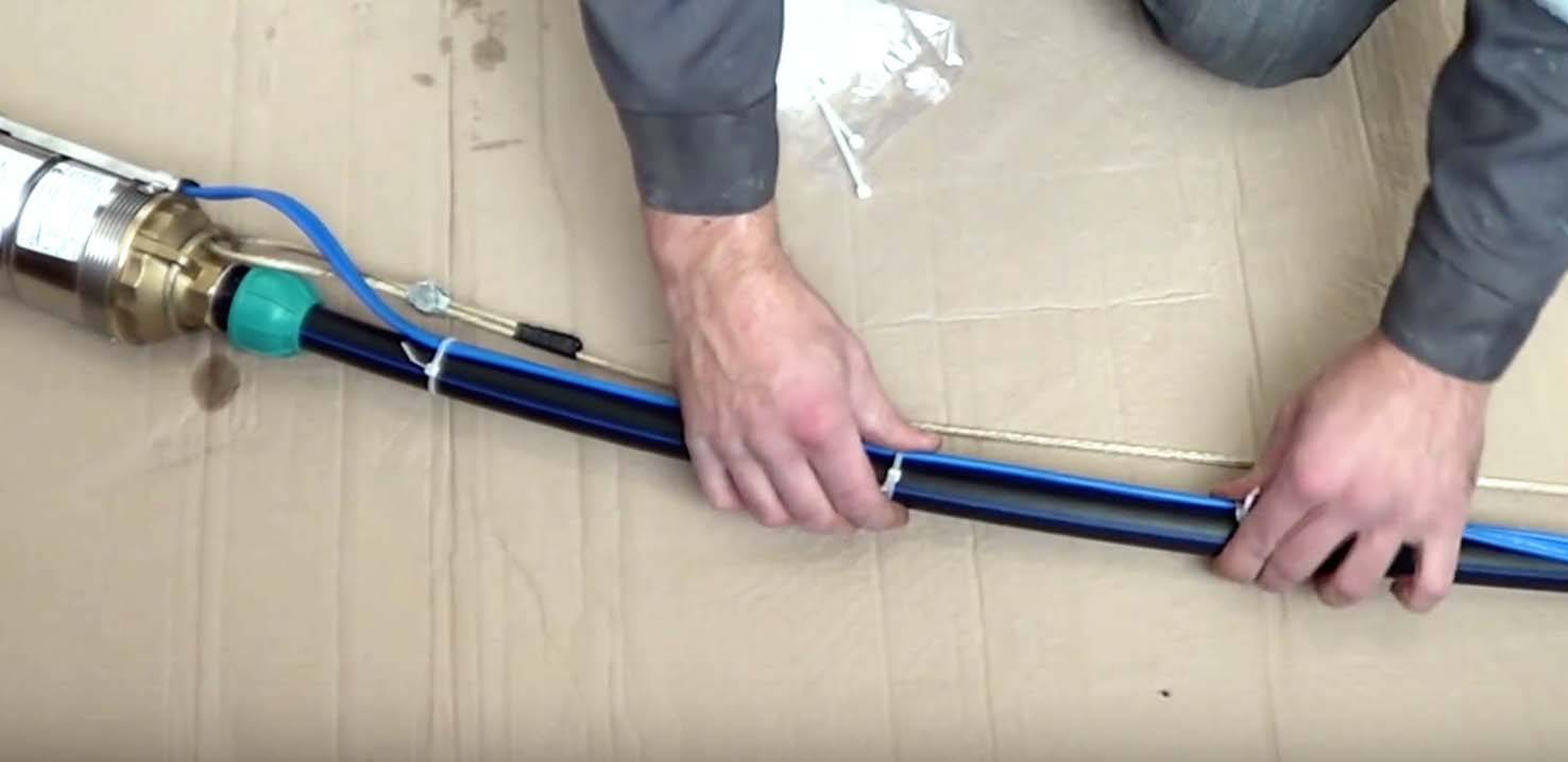 - Чтобы при опускании в шахту кабель и трос не задевали колонну, соединяем вместе со шлангом в единую плеть, используя пластиковые хомуты. В метре от помпы стяжки фиксируем через 20 см, а далее до верха обсадной – через метр.