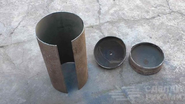 | Шаг 2 | Затем следует перейти к этапу разметки: – для крышки: за середину берем стык, от которого отступаем по 25 сантиметров с каждой стороны; – для подачи воздуха: от стыка в стороны отступаем по 12 сантиметров. После чего необходимо сделать разрезы в местах, где будут петли для крышки. Причем для удобства сварки, пока не следует делать других разрезов. |