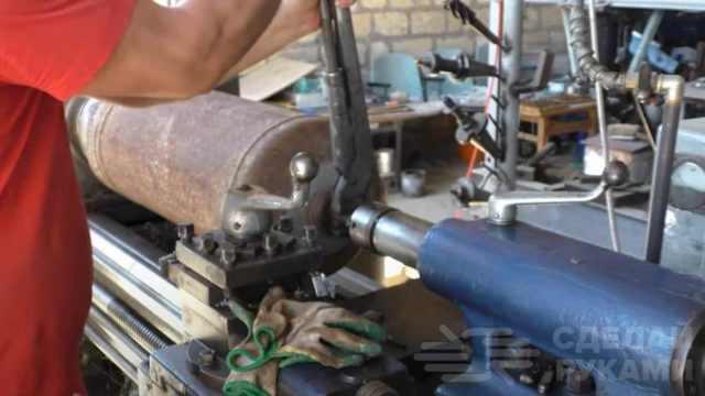 Закручиваем вентиль, и крутим баллон на токарном станке в течение получаса. Песок выступает в качестве абразива, и хорошо счищает «налет» на внутренних стенках.