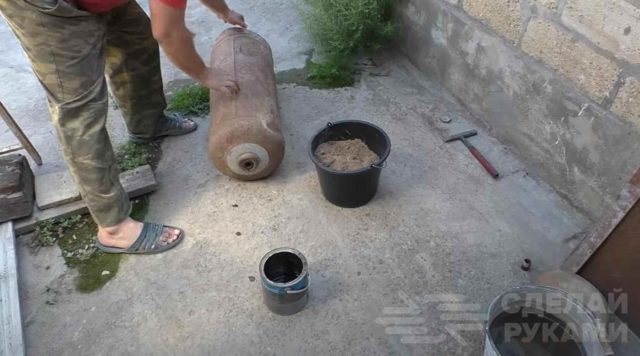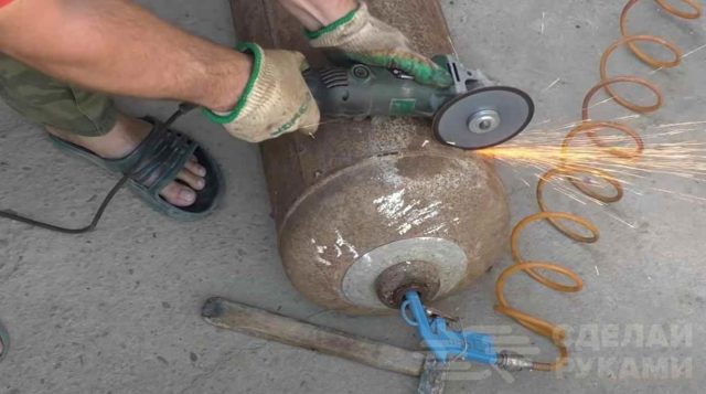 - Поскольку баллон нужно будет резать болгаркой, то необходимо правильно его подготовить — избавиться от остатков взрывоопасных веществ.