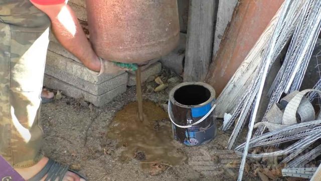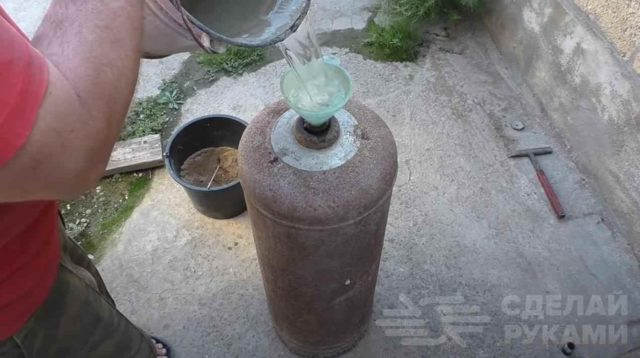 После этого надо слить остатки «жижи» из баллона: в какую-нибудь емкость или прямо на землю — но лучше подальше от дома, потому что неприятный запашок будет стоять долго.