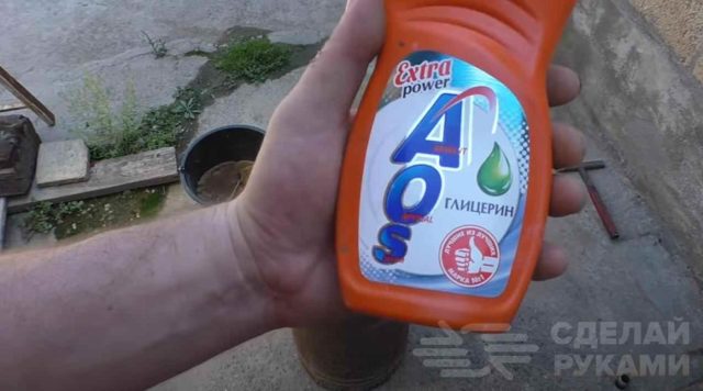 Для этого автор засыпает в баллон немного песка, наливает моющее средство и пять литров воды.