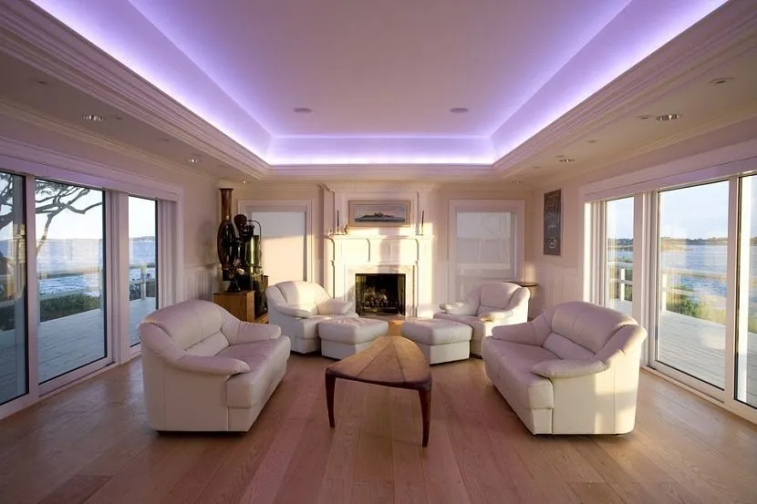 Применение светодиодной ленты улучшает внешний вид однотонного потолка, способствует созданию комфорта внутри помещенияИсточник roomester.ru