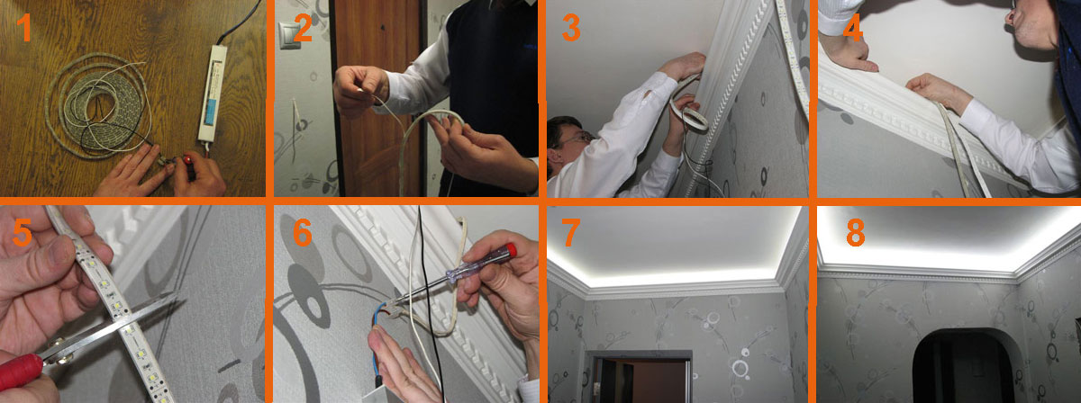 Лучше всего выполнять монтаж скрытой подсветки потолка светодиодной лентой, она просто укладывается внутри конструкции вместе с блоком питания.