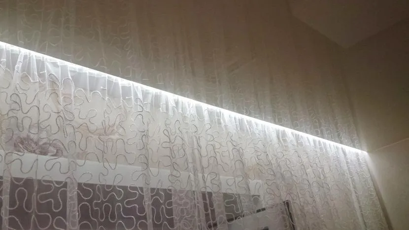 Чаще всего ленты крепятся в пазах между потолочным плинтусом и натяжной пленкой. Это делает подсветку полностью скрытой от визуального просмотра.