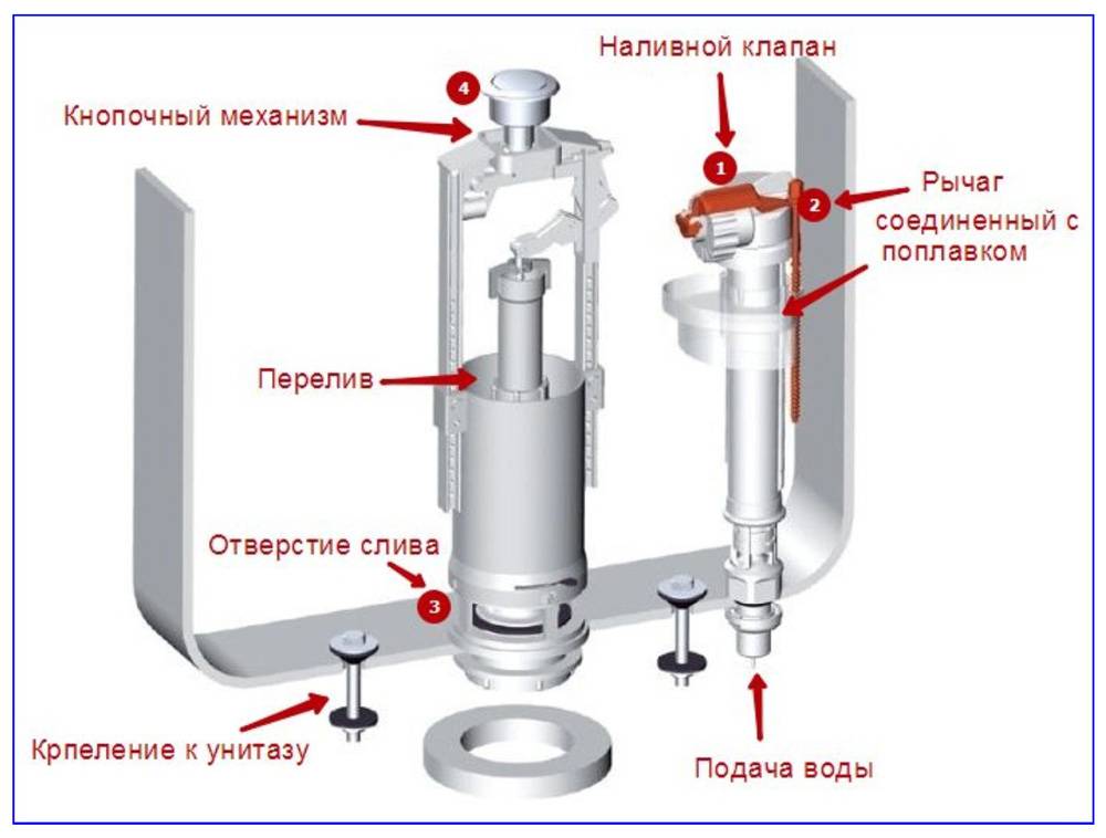 - Устройство для слива воды — это сливная труба, механизм спуска воды и клапан, который перекрывает слив воды в унитаз. Когда мы нажимаем на кнопку слива поднимается клапан. Вода из бачка вытекает с большой скоростью через сливную трубу.