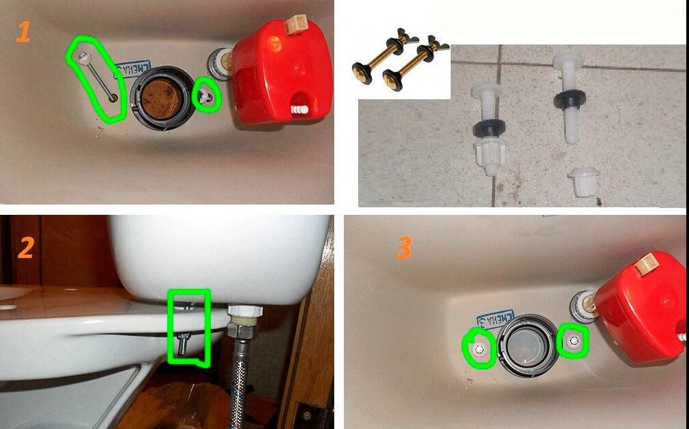 Для начала внимательно осмотрите арматуру. Возможно, потребуется замена всего нескольких болтов. Но про всякий случай лучше будет приобрести комплект для унитаза, благо стоит он довольно дешево. В любом случае следует полностью разобрать бачок унитаза, чтобы понять, почему идёт течь и почему он подтекает. Так что при выявлении дефектов, незамеченных невооруженным глазом вы будете только рады, что купили полноценный комплект болтов. Процесс замены: