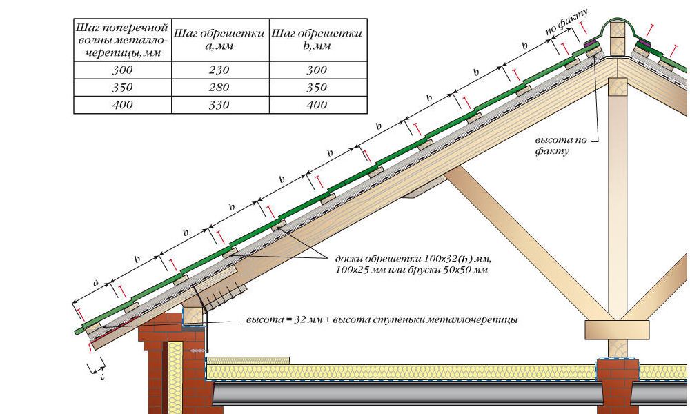 Размер и шаг обрешетки можно рассчитать самостоятельно, используя формулы. При этом следует учесть в обязательном порядке уклон и особенности конкретного материала. Для возведения обрешетки допускается выбрать брус, сечение которого составляет от 40 до 50 мм.