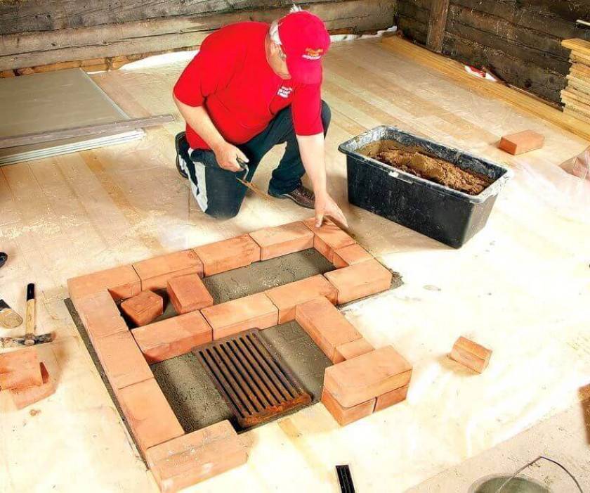 Иногда приходится закладывать основу уже на готовые полы. Если в доме используется система «теплых полов», приходится поднимать всю стяжку. После того как место для печи будет подготовлено, выкапывается яма глубиной до 35 см, полностью покрывается гидроизоляцией. Далее прокладывается арматура, и заливается раствор