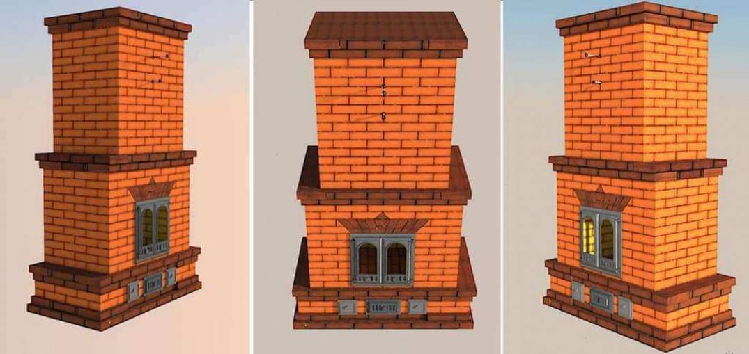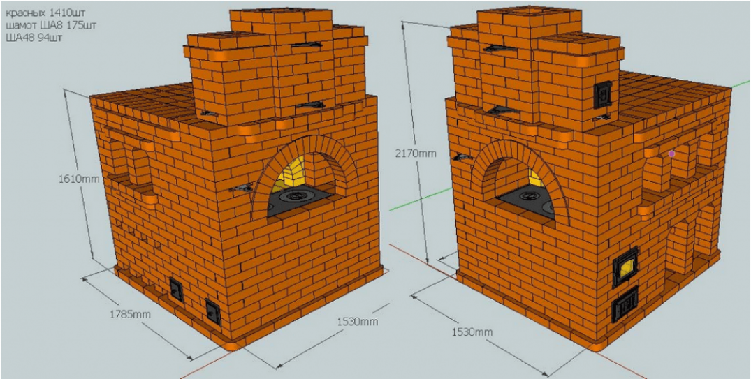 В этой модели также присутствуют дымовые задвижки в количестве 2 штук. Они располагаются вверху и посередине печки. Для чистки дымовых каналов в конструкции предусматривается одна дверца размером 400*200 мм. Чтобы построить данную модель, используют: