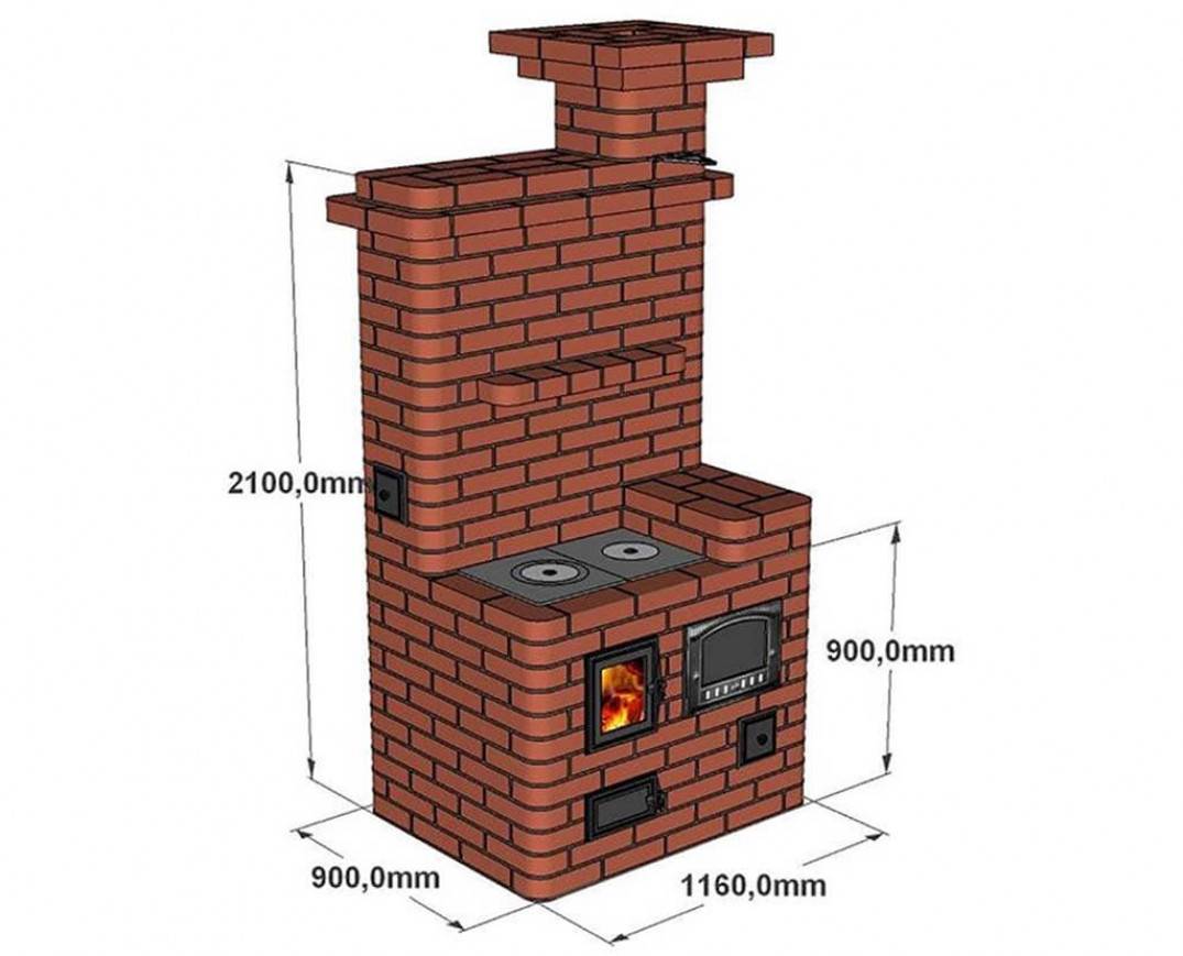 Этот вариант пригоден для отопления от 20 до 25 м². Стандартная длина, ширина и высота данной конструкции составляет соответственно 640, 510 и 2150 мм. Кроме топки, поддувала и дымоотводящих каналов, в печке еще присутствует варочная панель. Можно также построить модель с нишей для духового шкафа.