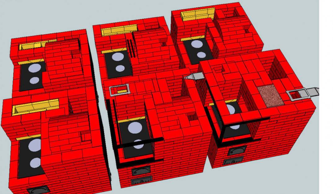 Свою особенность в такой печи имеют и внутренние каналы, которые предназначены для подачи горячего газа к топливным камерам и отвода угарных газов на улицу. Во время топки печи все дымовые газы поступают из большего по габаритам топливника в 1-й отсек отапливающей камеры.