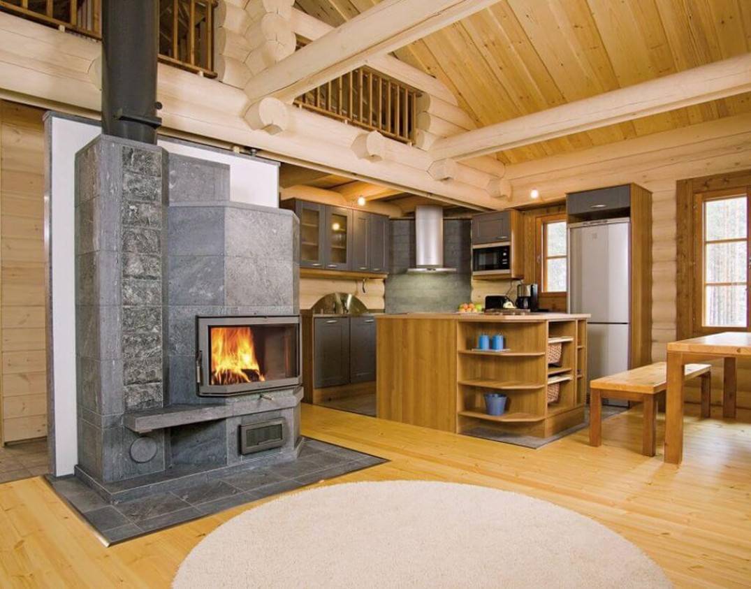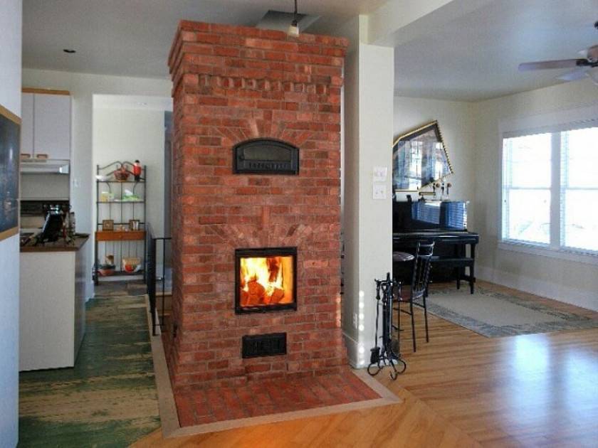 - здания, в которых нет несущих стен между залом и кухней. Уместно будет построить печь или камин из качественного кирпича углового расположения. Печку размещают около кухни, а каминную систему – ориентируют на 45 градусов в гостиной. На фронтальной или противоположных стенах организовывают топки;