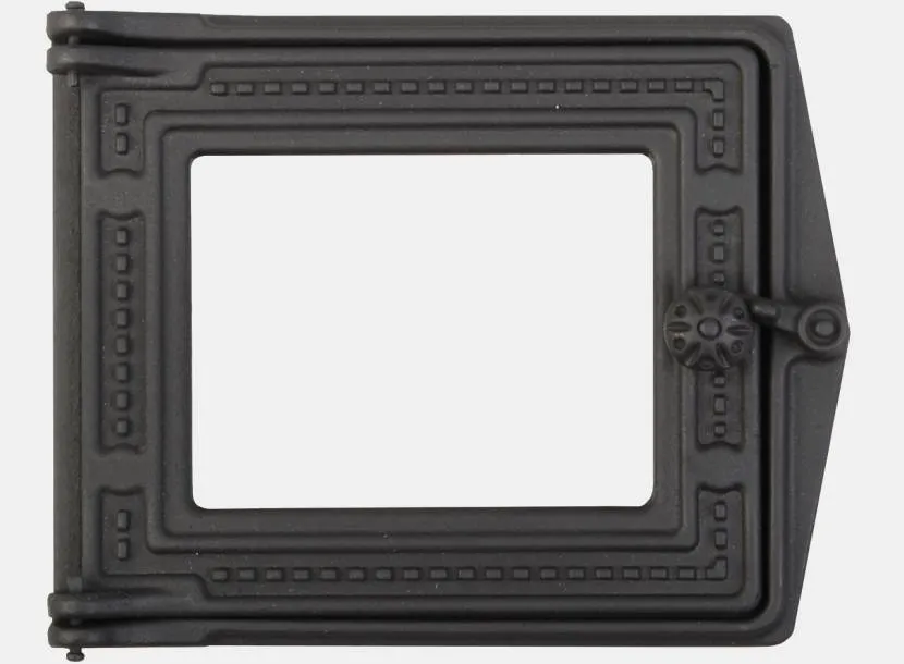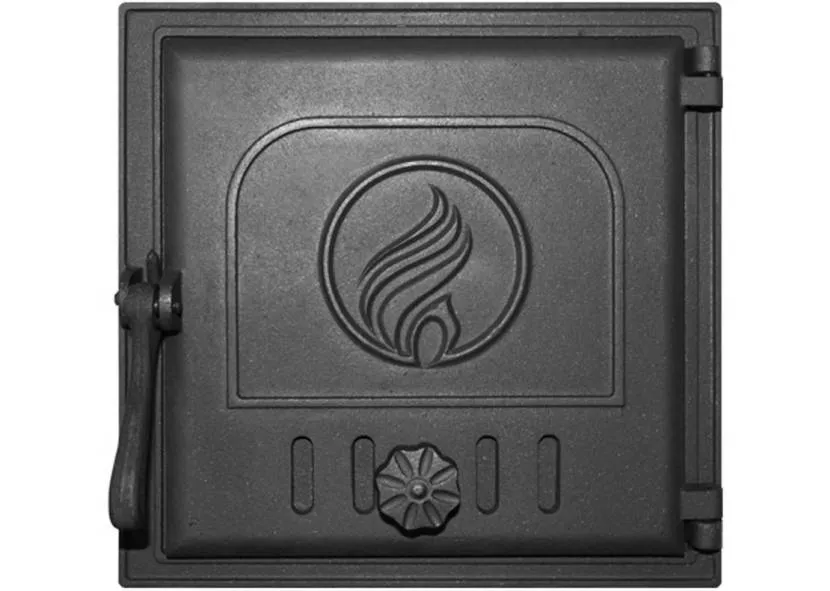 При разработке проекта выбирается топочная дверца 200*300 мм. Она может быть изготовлена из жаростойкого стекла или только чугуна. Выбор делают на основании эстетических предпочтений домовладельца. Если установить стеклянную дверцу, тогда через нее будет виден процесс горения дров. После ее монтажа отопительная конструкция будет немного похожа на камин.