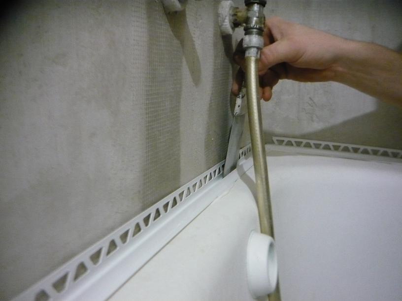 Вопреки распространенному мнению, уголок следует брать на пару миллиметров толще, чем плитка. Если сама плитка толщиной 8 мм, то уголок нужен 10 мм, тогда останется место под плиточный клей. Я произвожу монтаж уголка на ванну с помощью двух герметиков — силиконового и силиконизированного. Силиконовый является основным и препятствует попаданию влаги на штукатурку, а силиконизированный отлично замывается и разглаживается, позволяя заполнить неровности.