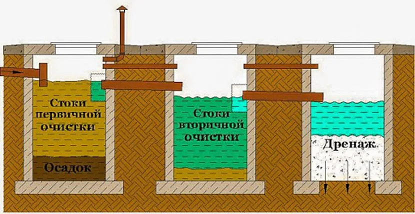 Представляют они собой емкость, разбитую на отсеки, или последовательность емкостей, как в случае септика с переливом, соединенных трубами и системой аэрофильтров. В первом отсеке стоки отстаиваются, все твердые отходы остаются на дне, а вода с мелкими фракциями перетекает в следующий резервуар, который может играть роль вторичного отстойника, а может быть предназначен для слива воды.