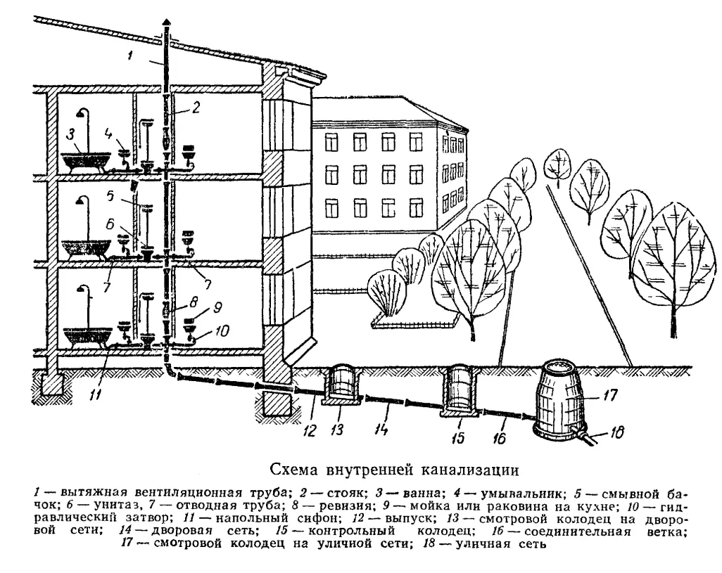 - центральный канализационный стояк, в него входят остальные элементы системы;