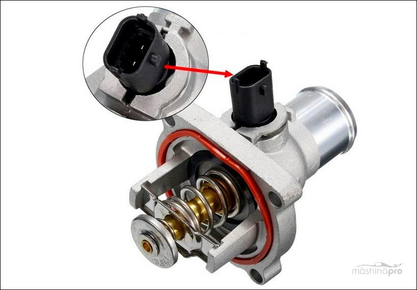 - Электронный (с электронным управлением) – представляет собой классический одноклапанный термостат, оснащенный нагревательным сопротивлением. Управление нагревом последнего реализуется электронным блоком управления двигателем. Таким образом, становится возможным достичь температуры 95-110°С на частичной мощности мотора и 85-95°С на максимальной мощности. В итоге это делает более экономичным расход топлива и повышает мощность благодаря дополнительному охлаждению всасываемого в цилиндры воздуха.