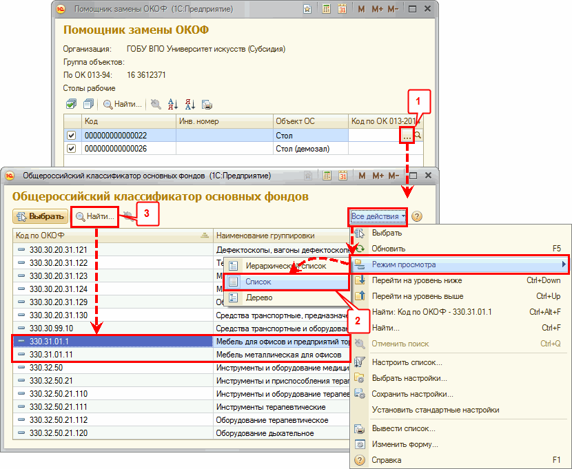 В соответствующей строке формы пообъектного изменения кодов ОКОФ Помощника откроем справочник «ОКОФ» (шаг 1), выберем новый классификатор ОК 013-2014. Для быстрого поиска в нем кода 330.31.01.1 отключим иерархический просмотр списка справочника (шаг 2) и укажем код 330.31.01.1 в поиске (шаг 3).