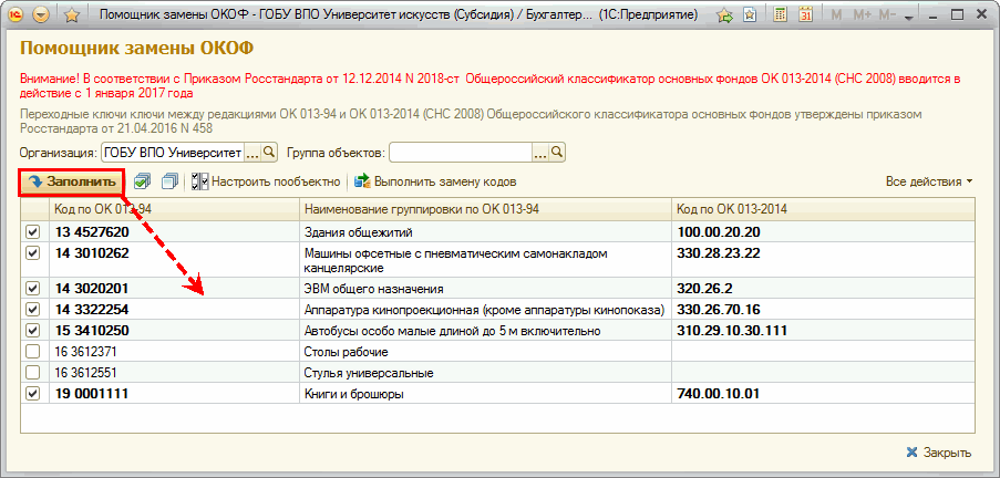 При нажатии кнопки «Заполнить» в таблице Помощника будут отражены присвоенные объектам ОС коды (и их наименования) по старому ОКОФ и соответствующие им коды по новому ОКОФ.