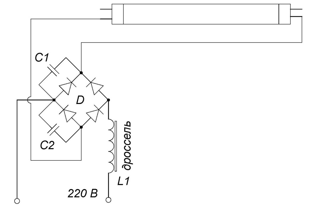 Стандартная схема, применяемая для подключения люминесцентных ламп, может быть видоизменена (идти без дросселя). Это позволит минимизировать рис выхода из строя осветительного прибора.