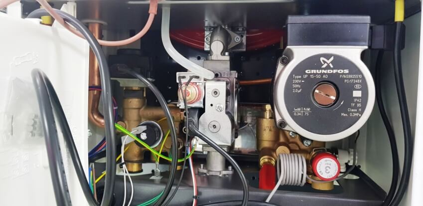 Гидравлическая система включает два теплообменника. Первый используется для нагрева воды и изготавливается из нержавеющей стали. Для контура отопления применяется второй теплообменник, который производится из меди. Внутри устанавливается латунный трехходовой клапан.