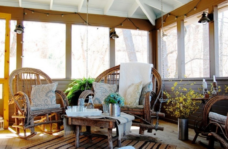 Домик в деревне предполагает строительство веранды из дерева и ее оформление в соответствующем стиле — с ткаными дорожками, занавесками с вышивкой, самоваром и глиняными горшками, простой и удобной мебелью.
