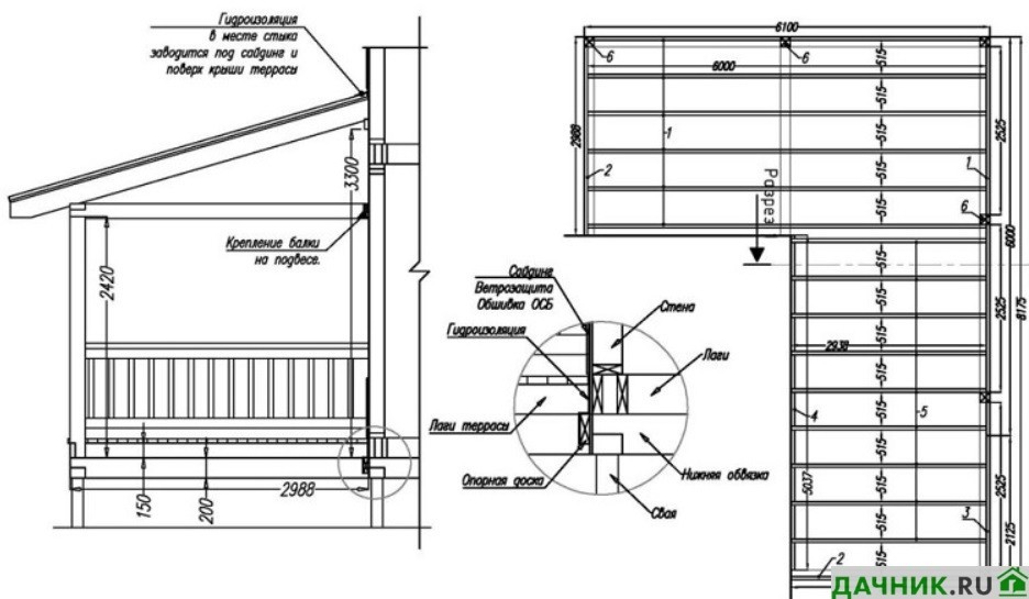 После выполнения брусовой обвязки пола террасы по периметру, уложите аналогичным образом несколько поперечных брусков того же сечения, устанавливая в заранее размеченные и выпиленные пазы с шагом около 1 метра, скрепив их длинными гвоздями.
