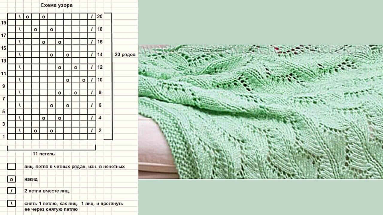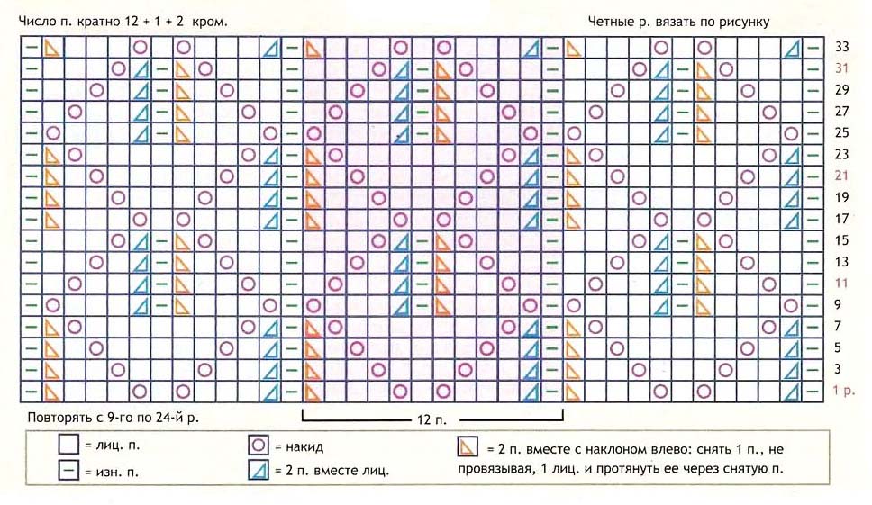 Раппорт составляет 17 петель в ширину и 4 ряда в высоту. Повторяйте его каждые 4 ряда.