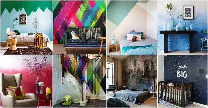Окрашивание стен часто выполняют в нескольких цветах. Обычно используют два близких оттенка, но применяются и абстрактные мотивы. Ломаные линии вдоль стены создают иллюзию объема.