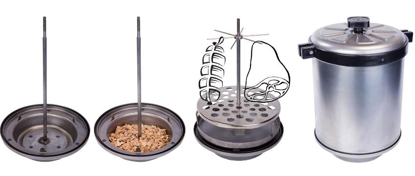 Подойдет бочка, большая кастрюля или металлическое ведро с крышкой. На дно емкости насыпаются щепки или опилки. Коптильня ставится на электрическую плитку или огонь.