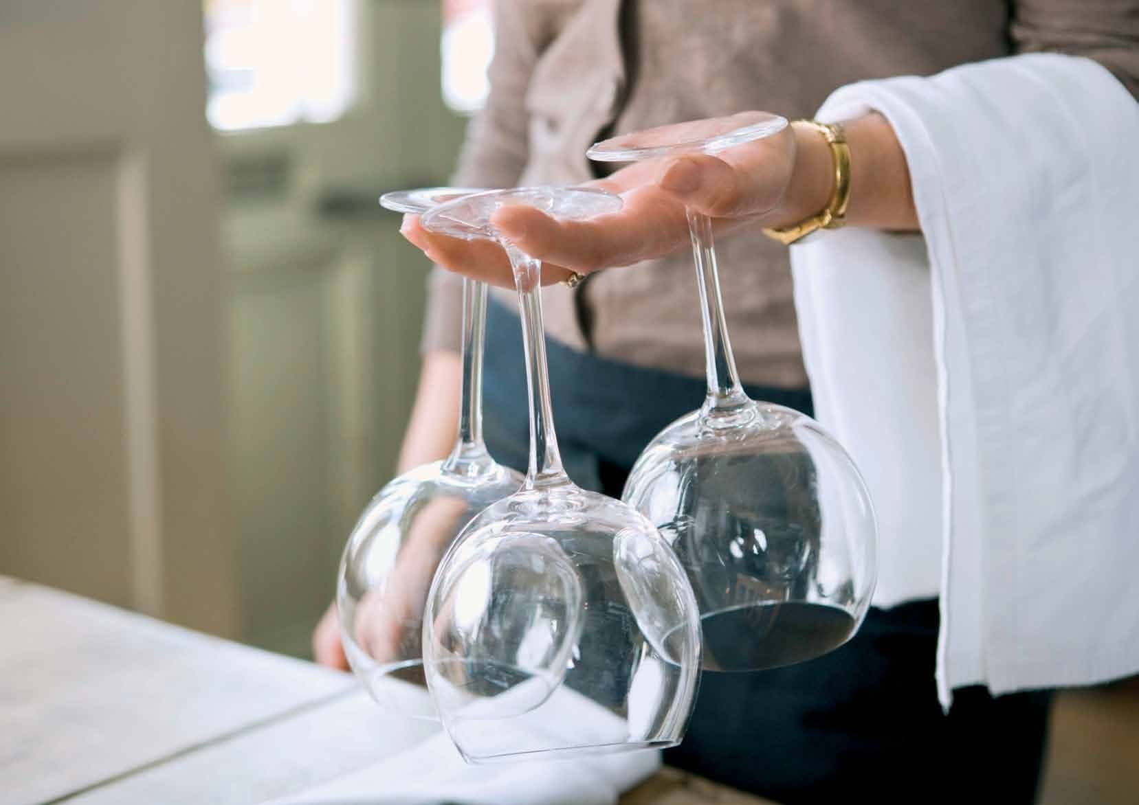Не рекомендуется держать бокалы за ножки пучком, их размещают между пальцами свободно, чтобы стенки не соприкасались.