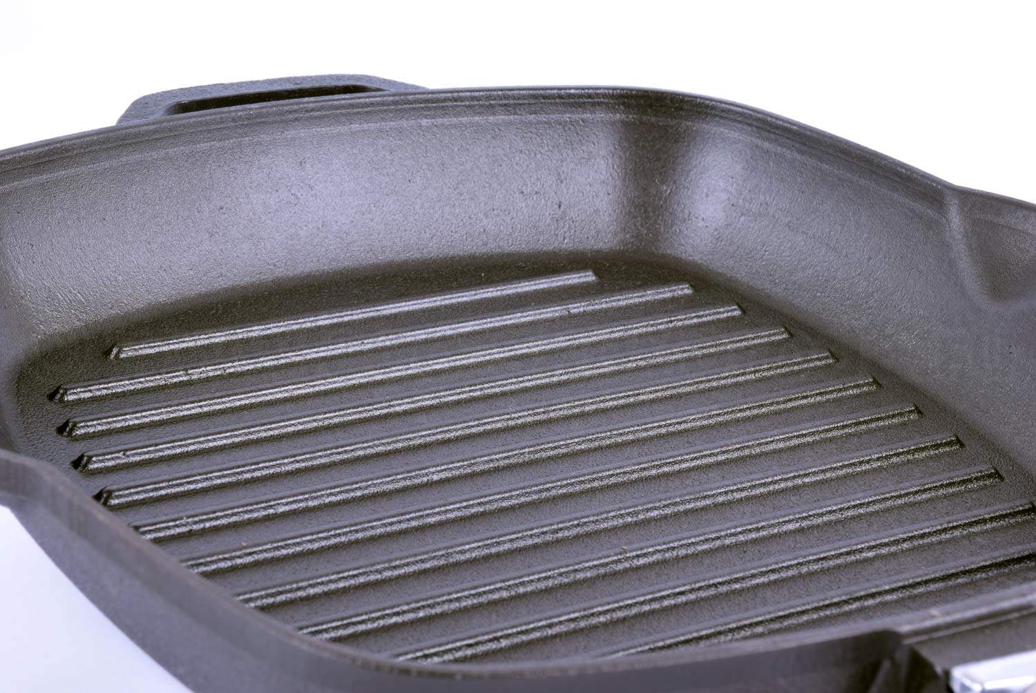 - хорошо, когда ручка цельнолитая и покрыта жаропрочным материалом. Не менее удобными являются складывающиеся ручки, которые позволяют использовать сковороду-гриль в духовом шкафу.