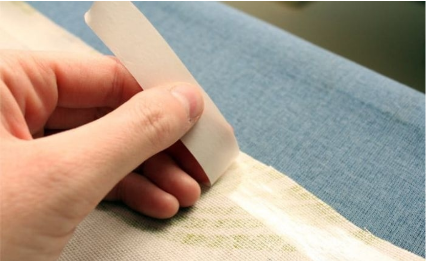 Если вы обрабатываете тонкие, деликатные материалы (органзу, шёлк), следы от проколов иглы могут остаться на ткани после снятия стежков. Чтобы подшить шторы своими руками, используйте для предварительной фиксации специальную тканевую полоску с клеящейся поверхностью: ткань подгибается до нужного уровня, фиксируется булавками, между слоями вкладывается лента и проглаживается горячим утюгом.