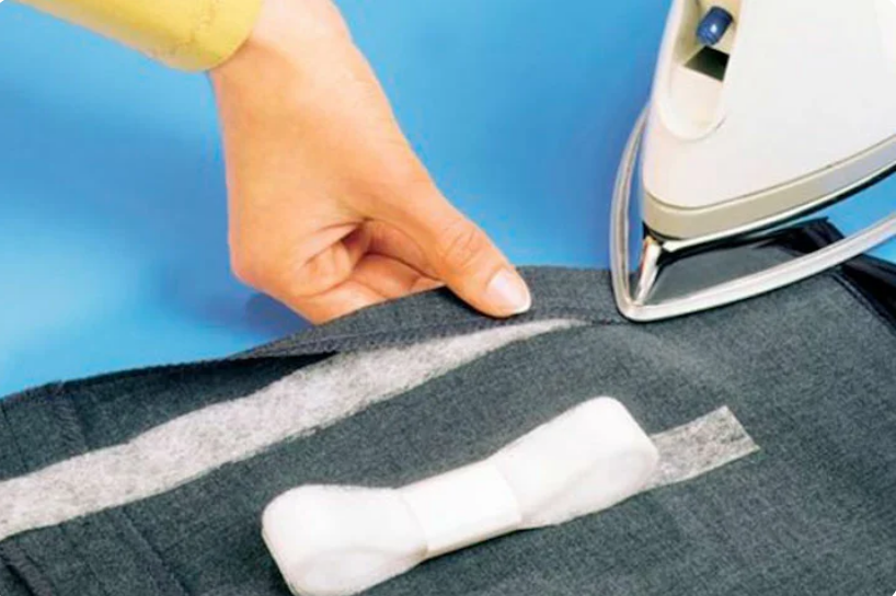 Отмерьте нужное количество материала и сделайте подворот в 10-30 мм. После пройдитесь по изгибу утюгом. Внутрь положите ленту-паутинку, чтобы закрепить подгибку. Снова пройдитесь горячим утюгом и закрепите ленту. Если ткань очень нежная, лучше между тканью и утюгом положить влажную марлю.
