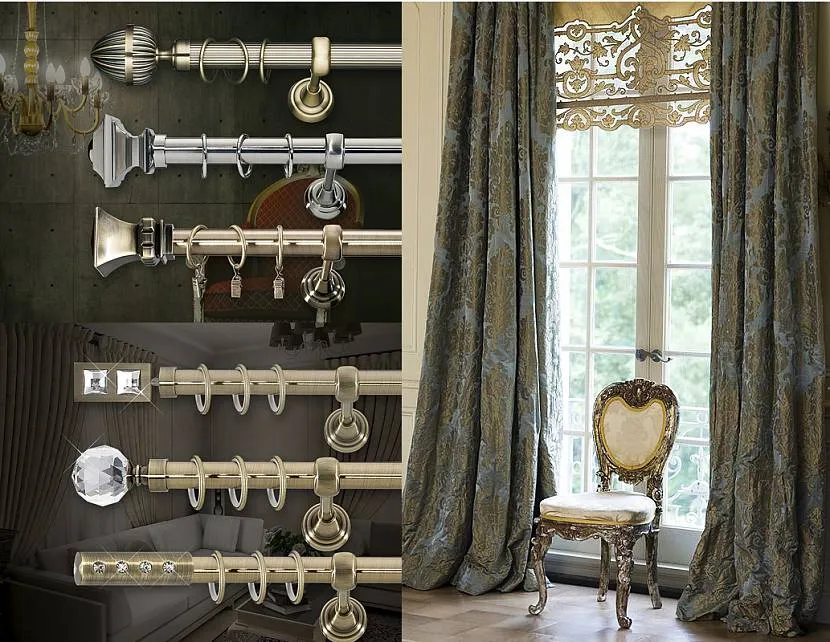 Металлические карнизы предпочтительны как самые долговечные и надежные. Они рассчитаны на массивные портьеры, многослойные, из тяжелых тканей. Материалом изготовления служит сталь, латунь, бронза и алюминий, самый бюджетный и потому ходовой вариант.
