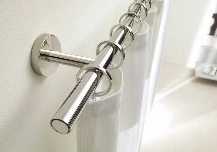 - Телескопические — небольшие трубки, которые протягивают в отверстия штор. Бывают металлическими, пластиковыми и деревянными. Следует вешать занавеску, используя кольца.