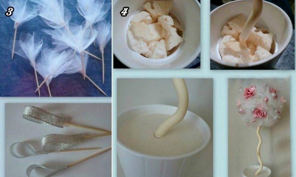 Свадебный топиарий — это очень хороший и бюджетный вариант оформления зала и столов. Для того чтобы сделать топиарий из атласных лент самостоятельно, необходимы такие материалы: