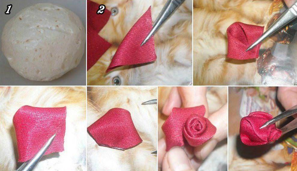 Как можно сделать розы. Сперва необходимо вырезать маленький квадрат из ленты, сложить по диагонали и склеить. После чего два уголка приклеить к основе лепесточка, к нижнему краю треугольника. Приготовьте необходимое количество материала, склейте розочки из всех лепестков: первый лепесток скрутите в трубочку, чтобы сделать сердцевину. Дальше аккуратно прикрепляйте лепестки по кругу. Не забываем оставить отверстие для ствола.