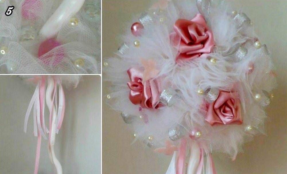 - Топиарий из фатина. Этот материал не только очаровательно выглядит, но и отлично подходит для этой цели. Крепить фатин требуется небольшой булавочкой. Именно поэтому перед работой стоит запастись такими принадлежностями.