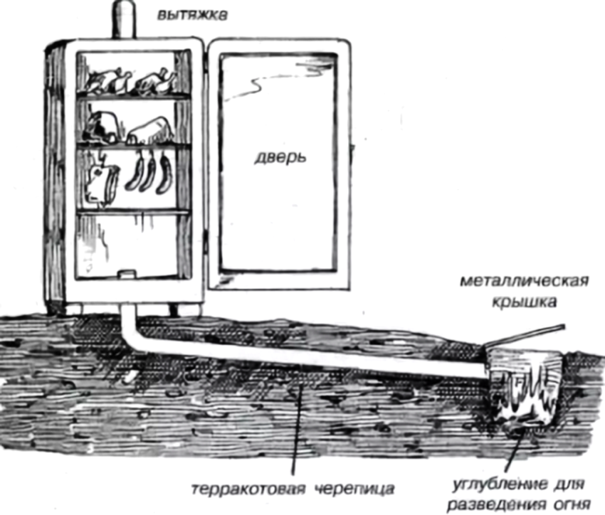 - вырыть траншею от костра к коптильне длиной от 4 до 7 м, проложить ее кирпичом, сверху накрыть металлическими листами или рубероидом, присыпать землей;