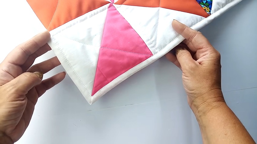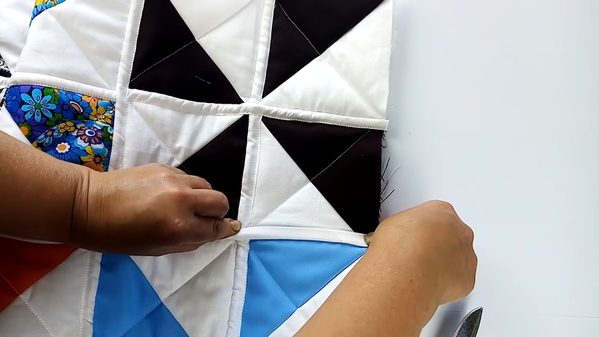 Разъедините блок, чтобы снаружи была лицевая сторона тканевых квадратов, и закрепите слои иголками. Затем с помощью трафарета прострочите заготовку по диагонали с другой стороны. |