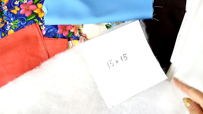 Для начала вырежьте бумажный квадрат размером 15*15 см. Используя этот трафарет, нарежьте утеплитель и тканевые квадраты. |