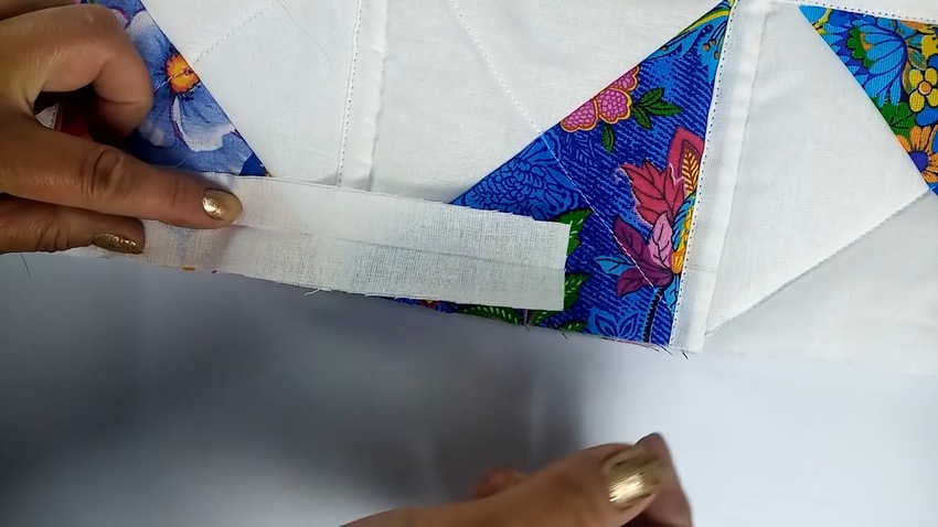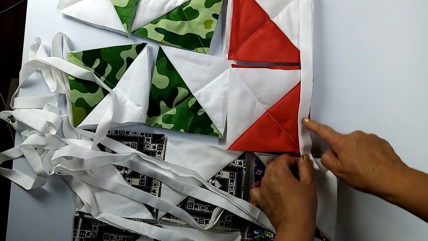 Затем приложите бейку к краю квадратов и прострочите ее посередине. К другой стороне ленты пришейте следующую полосу заготовок. То же самое проделайте с оставшимся материалом. |
