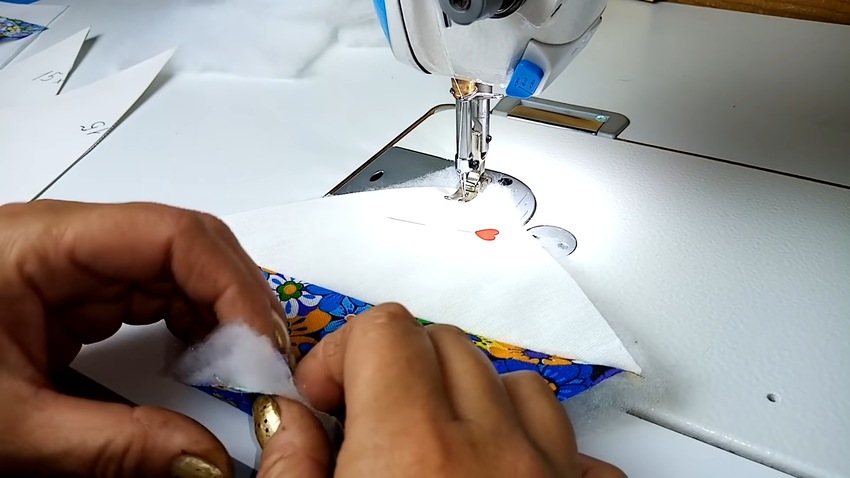 - Сложить две детали лицом друг к другу, сшить на машинке, оставив 10 см для выворачивая.