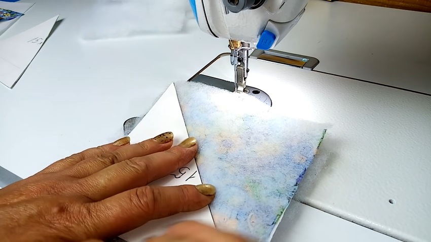 Уложите тканевые блоки лицом к лицу, на цветной квадрат наложите 1 получившийся слой утеплителя, а другой частью накройте другую сторону заготовки. Проложите строчку по диагонали, для удобства используя бумажный трафарет. |