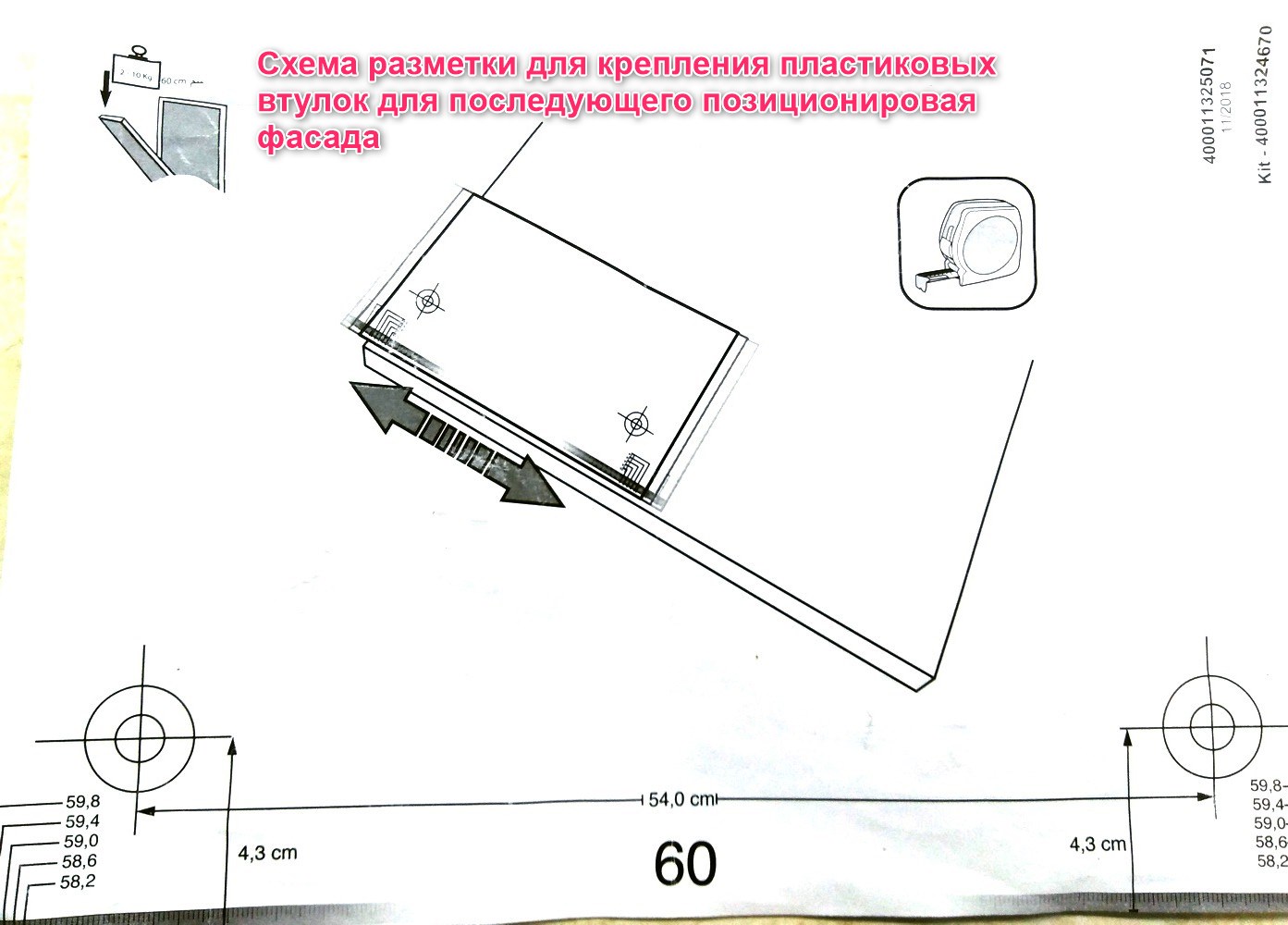 - Затем делается расчет мест для крепежных деталей фасада, сделать это необходимо, чтобы все детали меблировки совпадали по высоте: и у столешницы, и у шкафов.